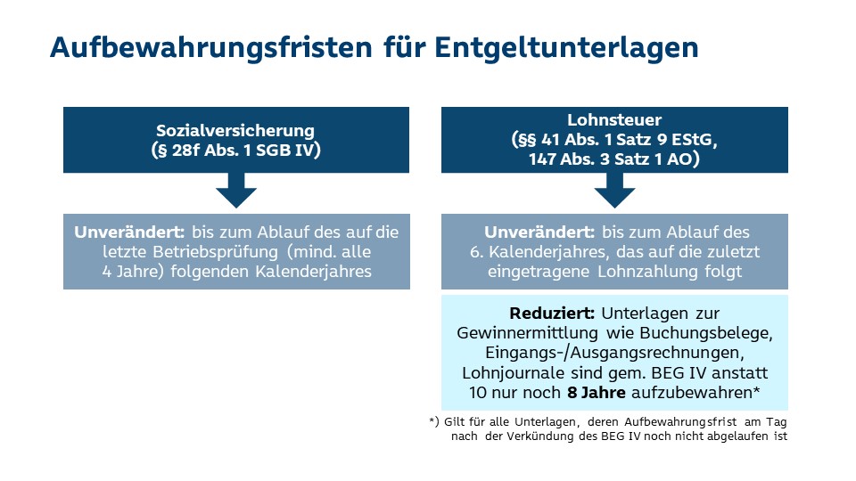 Sozialversicherung (unverändert): Der Arbeitgeber hat gemäß § 28f Abs. 1 SGB IV für jeden Beschäftigten, getrennt nach Kalenderjahren, Entgeltunterlagen im Geltungsbereich des Sozialgesetzbuchs in deutscher Sprache zu führen und bis zum Ablauf des auf die letzte Betriebsprüfung folgenden Kalenderjahres geordnet aufzubewahren (Ausnahme: Beschäftigte im Privathaushalt). Weitere Einzelheiten über den Inhalt der vom Arbeitgeber zu führenden Entgeltunterlagen sind der Beitragsverfahrensverordnung zu entnehmen.