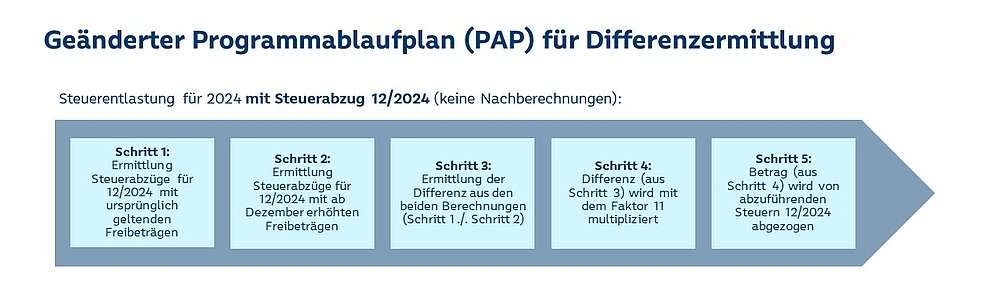 Das Bundesministerium der Finanzen hat im Einvernehmen mit den obersten Finanzbehörden der Länder für den Lohnsteuerabzug für Dezember 2024, also für die nachfolgend dargestellte Differenzermittlung, am 18. Oktober 2024 spezielle Programmablaufpläne (PAP) veröffentlicht (IV C 5 - S 2361/19/10008 :012).