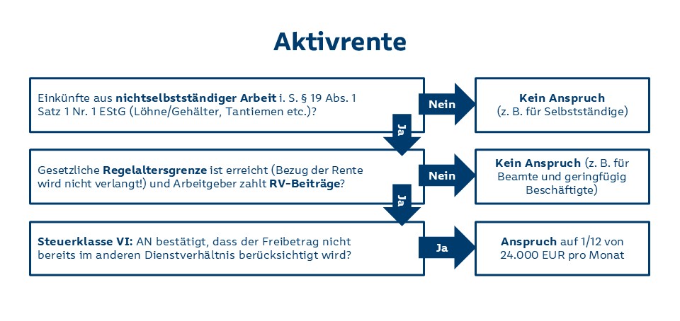 Die Aktivrente soll für sozialversicherungspflichtige Arbeitnehmer ab dem Folgemonat nach Erreichen der Regelaltersgrenze gelten (§ 3 Nr. 21 EStG-E). Dabei erfolgt die Begünstigung unabhängig davon, ob die Steuerpflichtigen eine Rente beziehen oder den Rentenbezug aufschieben. Mit der Bezugnahme auf Tätigkeiten nach Erreichen der Regelaltersgrenze werden somit Zahlungen für Tätigkeiten vor dem Erreichen der Regelaltersgrenze nicht begünstigt, auch wenn sie nach Erreichen der Regelaltersgrenze zufließen.