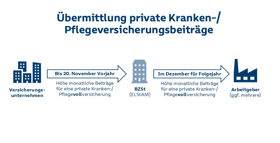 Künftig erfolgt im Rahmen des Lohnsteuerabzugsverfahrens zwischen den inländischen Unternehmen der privaten Kranken- und Pflegeversicherung, dem Bundeszentralamt für Steuern (BZSt) und den Arbeitgebern ein Datenaustausch. Die entsprechenden Regelungen wurden mit dem Jahressteuergesetz 2020 beschlossen und mit dem Jahressteuergesetz 2022 konkretisiert. Der gesetzlich vorgesehene Starttermin wurde mit dem Kreditzweitmarktförderungsgesetz vom 22. Dezember 2023 auf den 1. Januar 2026 festgelegt (§ 52 Abs. 36 Satz 3 und 4 EStG). Die rechtlichen Grundlagen für dieses Datenaustauschverfahren ergeben sich insbesondere aus § 39 Abs. 4 Nr. 4 und Abs. 4a EStG.