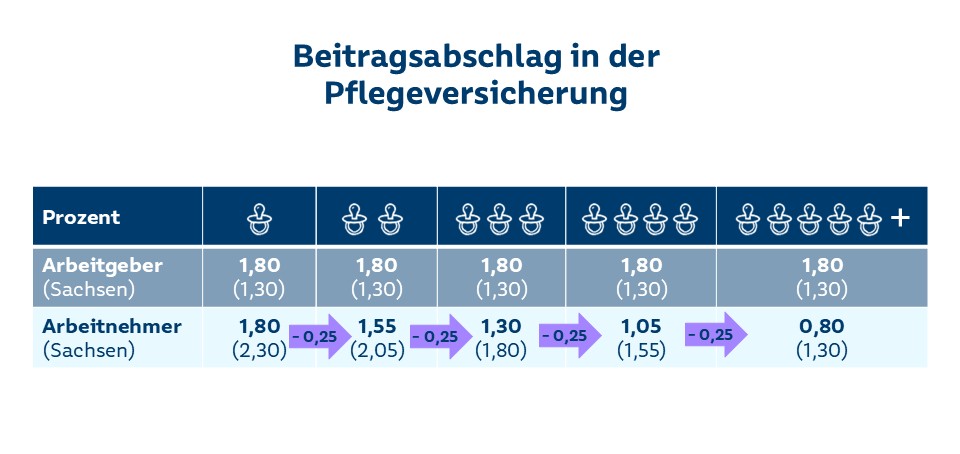 Für Arbeitnehmer (und Versorgungsbezieher) mit Elterneigenschaft reduziert sich der Beitragssatz zur Pflegeversicherung für jedes berücksichtigungsfähige Kind ab dem zweiten Kind bis zum fünften Kind um jeweils einen Beitragsabschlag in Höhe von 0,25 Beitragssatzpunkten. Der Beitragsabschlag für Eltern beträgt somit