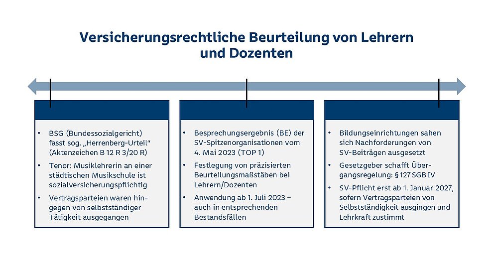 Nach der Übergangsregelung in § 127 SGB IV soll eine Feststellung des Sozialversicherungsstatus von Lehrkräften als abhängig beschäftigt durch die Sozialversicherungsträger bis zum 31. Dezember 2026 ohne Wirkung bleiben; d. h. die Versicherungspflicht soll erst ab dem 1. Januar 2027 beginnen. Dies gilt immer dann, wenn